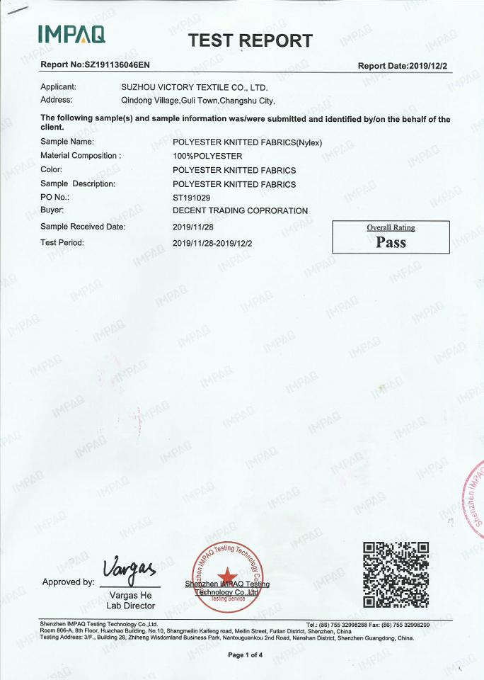 Suzhou Victory Textile Certificates & Product Test Reports etc.